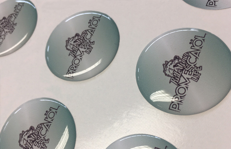 Questi adesivi sono stampati in digitale su un pvc con colla ad alta appiccicosità, poi vengono ricoperti con una resina poliuretanica in modo da creare un effetto 3D gommato.