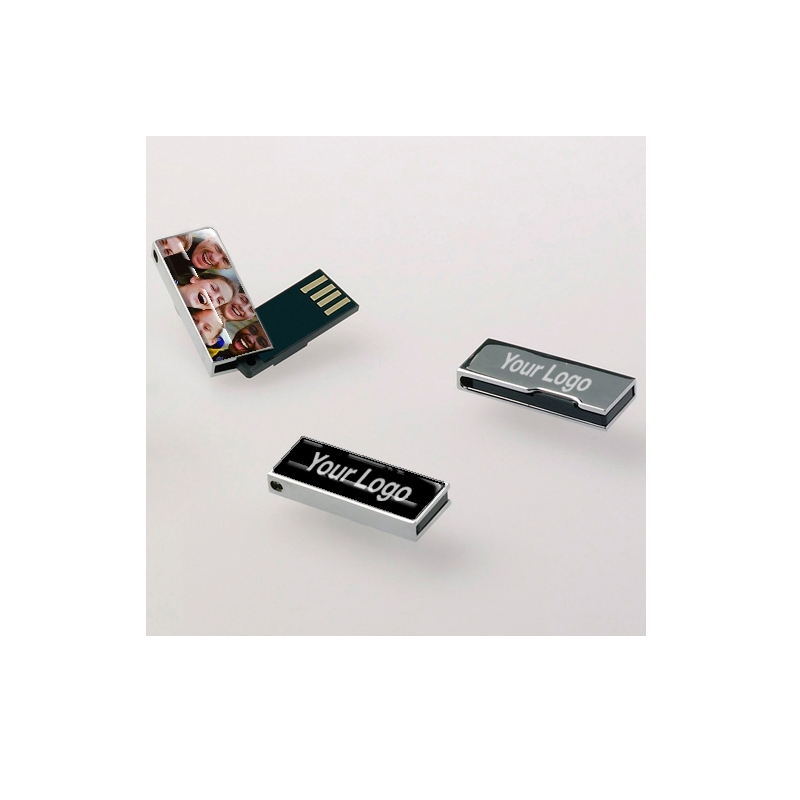 Chiave USB in metallo, caratterizzata dalla forma rettangolare e dalle dimensioni ultra ridotte, grazie al chip COB di nuova generazione. L'apertura avviene tramite movimento rotatorio sul lato ed è dotata di foro angolare, funzionale al passaggio degli accessori. Il fronte è interamente personalizzabile con resina epossidica, il retro con serigrafia o laser.