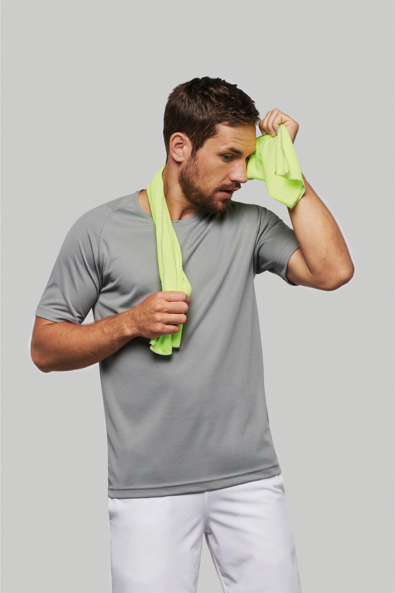 100% poliestere. Una volta bagnato con acqua e strizzato rinfresca all'istante, permettendo di abbassare la temperatura media del corpo. Finiture a sopraggitto a contrasto.