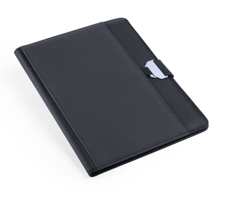 Cartella con elegante combinazione di poliestere e morbida pelle PU. Con chiusura originale tramite fibbia in metallo. Interno con scomparti per USB, power bank, scomparto per smartphone touch screen, porta carte e portapenne. Incluso anche bloc notes da 20 fogli bianchi. Confezionato singolarmente in elegante scatola nera.