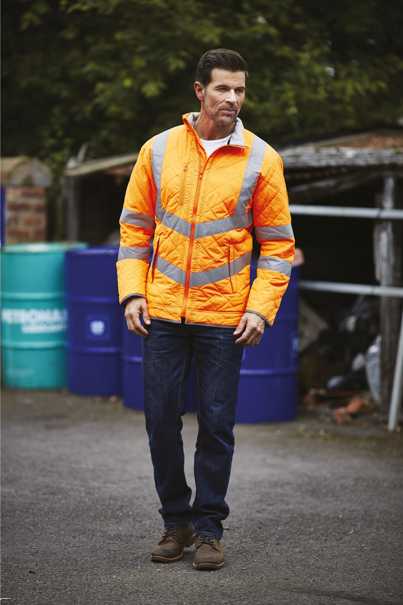 100% poliestere esterno idrorepellente con fodera in pile e imbottitura 100% poliestere. 2 fasce riflettenti (larghezza 5 cm) a forma di V su corpo e braccia per una maggiore visibilità. Collo alto con proteggi mento integrato. Tasca con zip sul petto. 2 tasche laterali scaldamani con zip. 1 tasca applicata nella fodera fissa in pile. Bordini riflettenti a fondo manica e fondo capo. Zip per personalizzazione invisibile a fondo capo (lato interno). Conforme alla norma EN ISO 20471:2013 Classe 3 (solo i colori Hi-Vis Yellow e Hi-Vis Orange) e alla norma britannica GO/RT 3279 Issue 8:2013 relativa agli "Indumenti ad alta visibilità" nel settore ferroviario (solo Hi-Vis Orange).