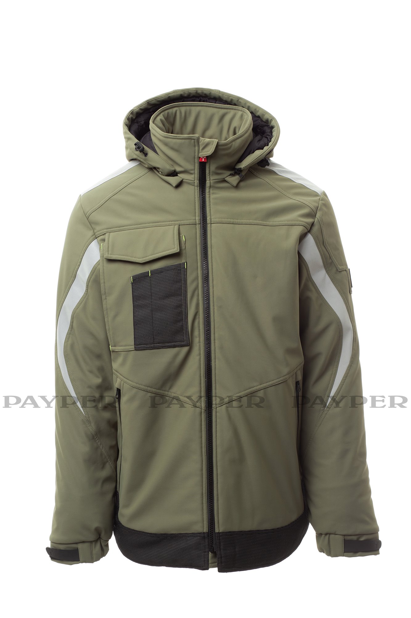 WP 8000 mm H₂O, WVT 5000 g/m² 24h. Soft-shell imbottito da uomo, chiusura tramite zip SBS con cursore in metallo "semi-auto lock" e tiretto personalizzato. Cappuccio removibile, con coulisse regolabile. Nastro retroriflettente su spalle e braccia. Polsini elasticizzati, regolabili con velcro e polsino interno. Tasca al petto Lock System con pattina, porta badge e porta penne. Due tasche laterali chiuse con zip dal nastro spalmato. Elemento "life-saving" sul retro con logotipo interno retroriflettente, chiuso con zip spalmata. Due tasche interne di cui una con porta tablet chiusa con velcro ed una sagomata con zip su petto destro. Fondo regolabile con stopper personalizzati. Tessuto puntinato con effetto retroriflettente.