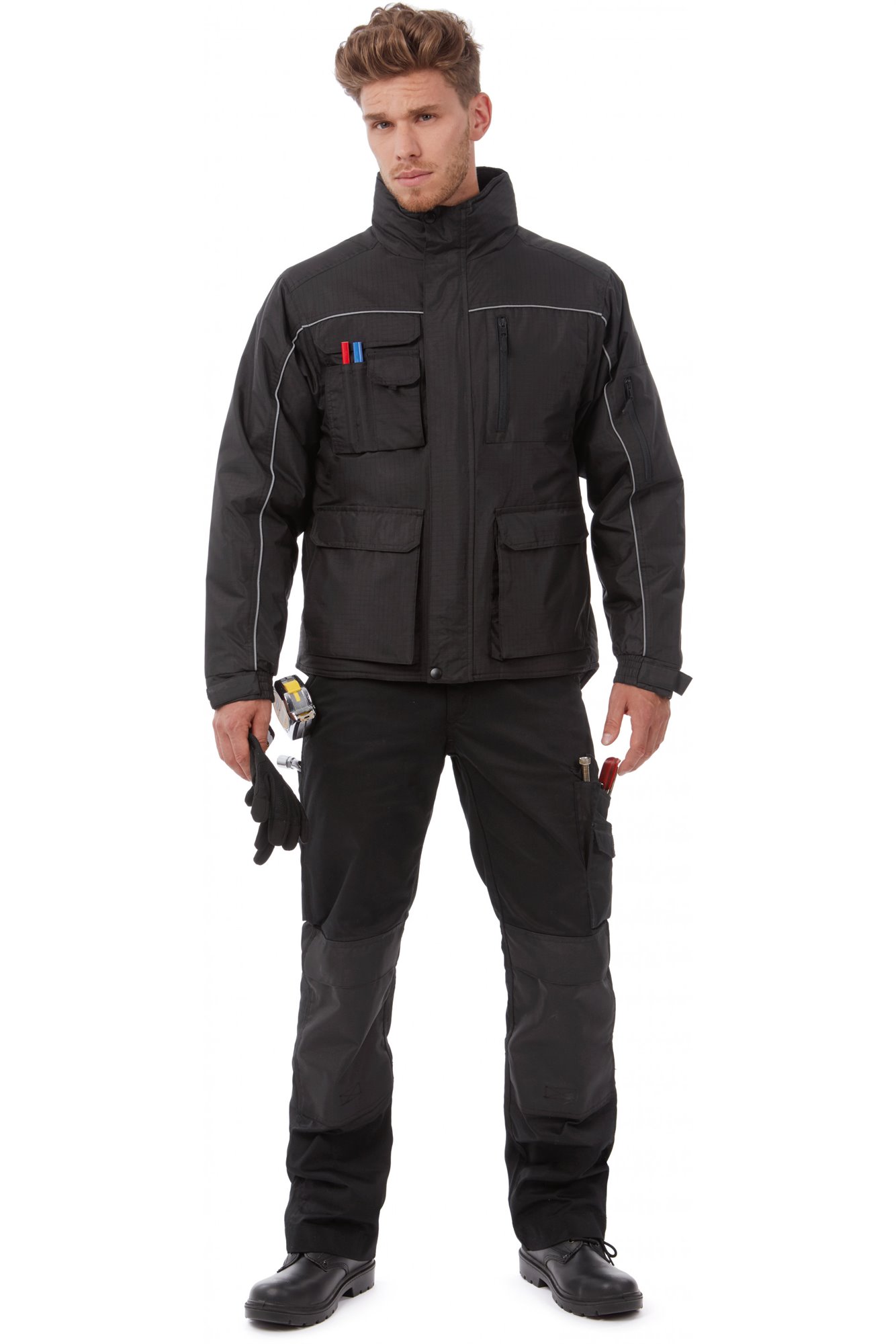 Esterno: 100% poliestere rip-stop, impermeabile (5000 mm) e antivento. Interno: Fodera imbottita termoisolante pesante (200 g/m²). Giacca super-funzionale PRO pesante con cappuccio nascosto ergonomico. 12 tasche multifunzione. Orlo posteriore più lungo. Piping riflettente sul davanti e sul dietro. Il rivestimento esterno in rip-stop garantisce resistenza contro le abrasioni e gli strappi. 1 tasca esterna per il telefonino con chiusure in velcro. 3 tasche portapenne esterne, 2 tasche frontali a doppio ingresso con accesso scaldamani laterale in pile. 1 taschino interno a toppa per portafoglio. 1 tasca sul braccio con cerniera. Tiranti zip ergonomici per un facile accesso. Polsini regolabili con patte di chiusura in velcro.