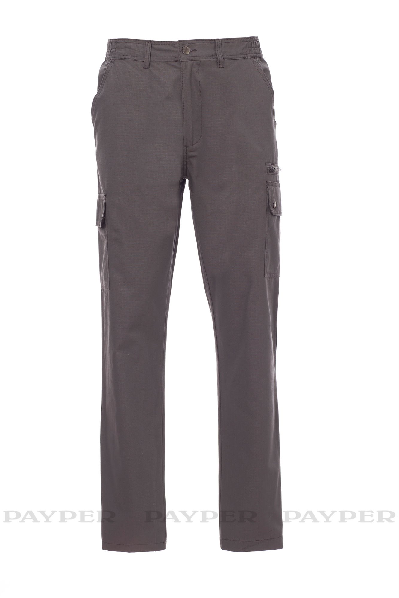 Pantalone uomo, estivo, elastici laterali e passanti in vita, chiusura con zip e bottone in metallo, due tasche anteriori a taglio classico, due tasche laterali con patta e bottoni automatici, una tasca con zip lato sinistro, un porta metro a scomparsa lato destro, due tasche posteriori a filo con asola e bottone.