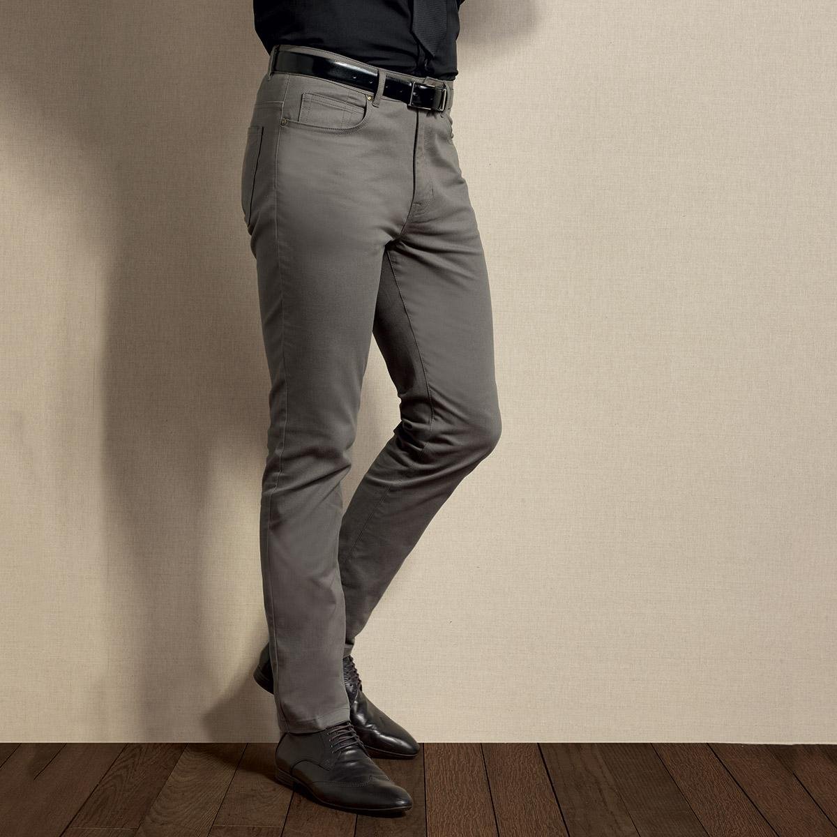 63% poliestere, 35% cotone, 2% elastan. Pantalone uomo dal taglio classico, due tasche frontali e rivetti. Due tasche applicate sul retro. Passanti per cintura. Lampo YKK con patta e bottoncino metallico sulla chiusura in vita. Tessuto elastico.