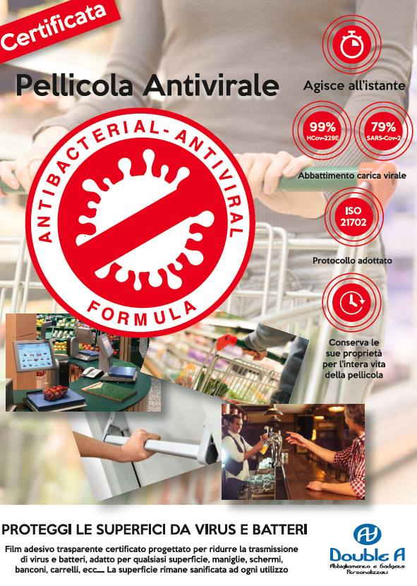 Pellicola Certificata antibatterica e antivirale, adatta per tutte le superfici, uccide virus e batteri fino al 99%, è efficace per tutta la durata della pellicola, il materiale di cui è composto è un pvc con al suo interno ioni d'argento che rendono inospitale la superficie per virus o batteri.