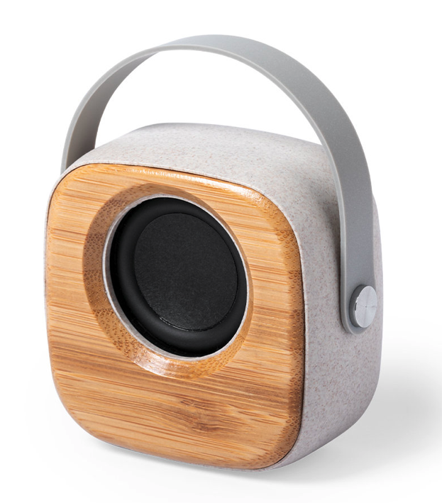 Altoparlante Bluetooth in una combinazione di pezzi di bambù dal taglio naturale e corpo in fibra di grano, per promuovere l'uso di materie prime naturali e ridurre le emissioni inquinanti. Di dimensioni compatte e con una pratica maniglia per il trasporto in morbido silicone, diventa un complemento perfetto per il tuo smartphone.