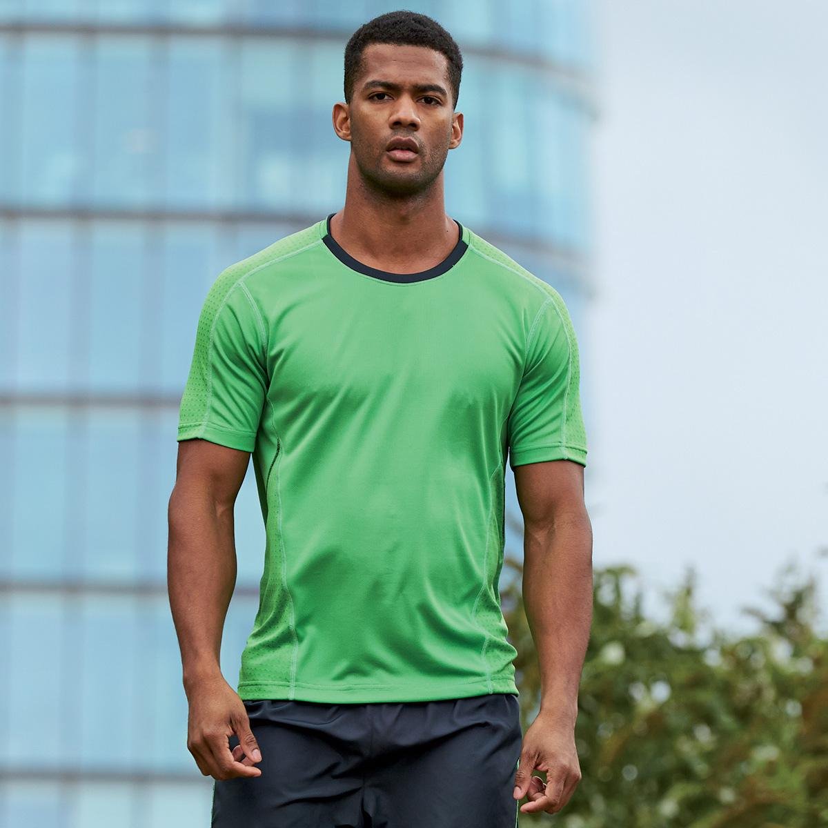 100% poliestere. T-shirt maniche corte set-in, traspirante, regola lumidità ad asciugatura rapida, inserti e cuciture flatlock di colore contrastante, logo catarifrangente sul retro, struttura con pannelli laterali, colletto in contrasto.